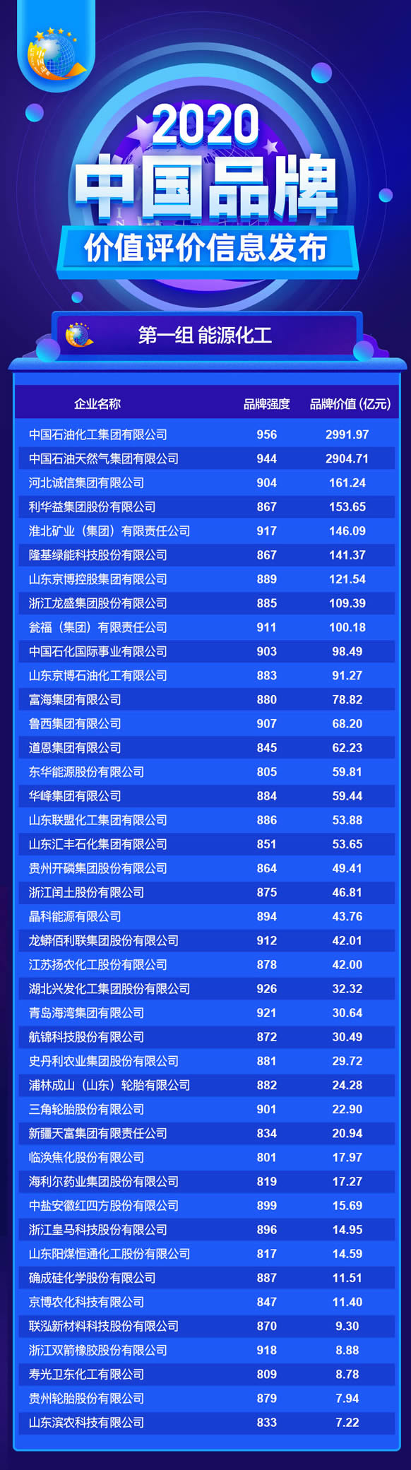 自2013年中國品牌建設促進會首次開展品牌價值評價發布以來,連續七年的品牌價值評價工作越來越得到社會各界的關注和認可。據悉,今年在參評條件要求較高的前提下,申報評價的品牌數量達到了830個,包括大部分行業的龍頭企業。本次發布品牌數量達564個,其中品牌價值超過千億元的有中國工商銀行、中國石化、中國石油等15家,另有雅戈爾、洋河、波司登、濰柴動力等129個品牌價值超過百億元。