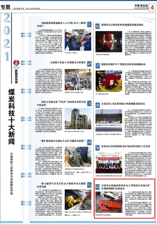 《全國首臺柴油機(jī)單軌吊無人駕駛機(jī)車在淮北礦業(yè)集團(tuán)楊柳礦試驗(yàn)成功》入選“2021煤炭科技十大新聞”