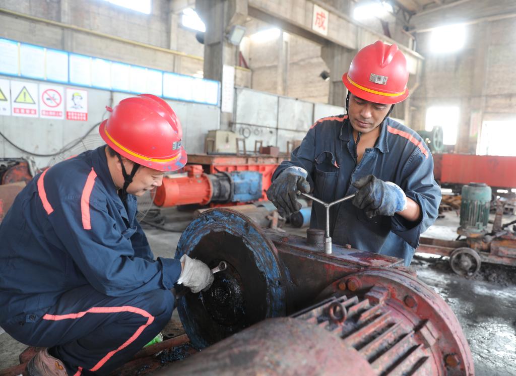 機(jī)電科職工宋佳芳和張連玉正在維修耙矸機(jī)齒箱。“多修一臺(tái)設(shè)備,就能節(jié)省一點(diǎn)費(fèi)用,也能為礦井修舊利廢工作出把力。”兩人堅(jiān)定地表示。