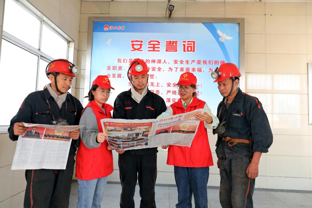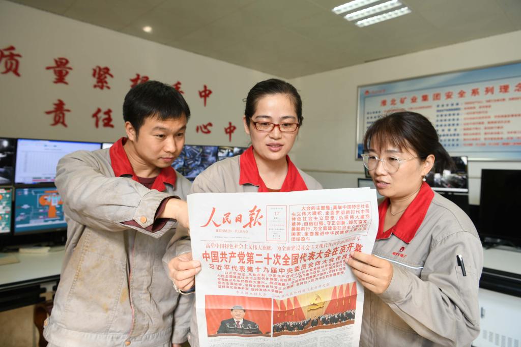臨選廠迅速掀起學習宣傳黨的二十大精神熱潮,用黨的二十大精神統領和指導各項工作,全力推進企業高質量發展。圖為該廠西區選煤車間生產一線的干部職工利用工作間隙學習黨的二十大精神。(攝影、撰稿:石啟元 陳桂芳 審核:劉小礦)
