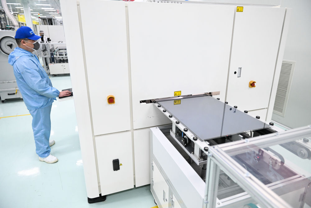 2024年2月29日,在位于江蘇省無錫市錫山區的極電光能有限公司智能生產車間,鈣鈦礦光伏組件正在自動化生產線上進行激光劃刻工藝。新華社記者 季春鵬 攝