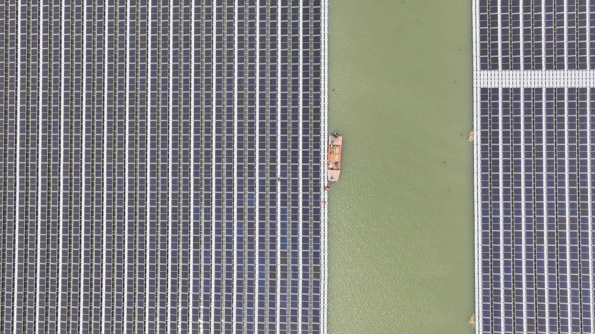 5月11日,航拍電力分公司青東塌陷區28MW水面光伏發電項目建設現場
