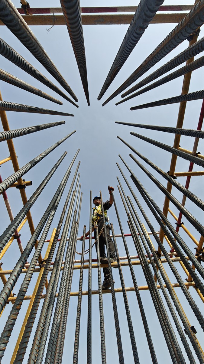 5月13日,工人在聚能發電公司機組項目建設現場綁扎鋼筋