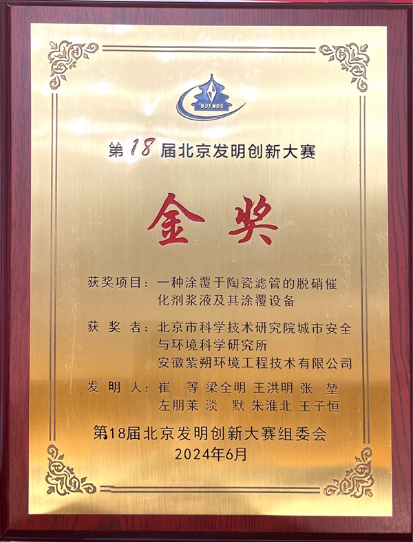 日前,在第18屆北京發(fā)明創(chuàng)新大賽頒獎典禮上,紫朔環(huán)境公司憑借卓越的研發(fā)實力,“一種涂覆于陶瓷濾管的脫硝催化劑漿液及其涂覆設(shè)備”的創(chuàng)新項目獲得大賽金獎。