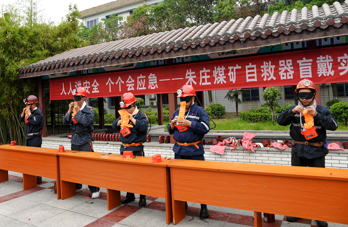 朱莊礦開展“自救器盲戴練兵”活動,確保職工遇到險情時能夠快速、準確、安全地使用自救器(張宗風 攝)