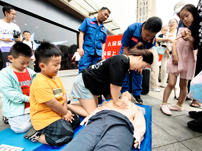 6月16日,救護大隊志愿者走到街頭,向市民講解、傳授急救知識,吸引眾多市民駐足觀看并參與。(吳加奇 攝)