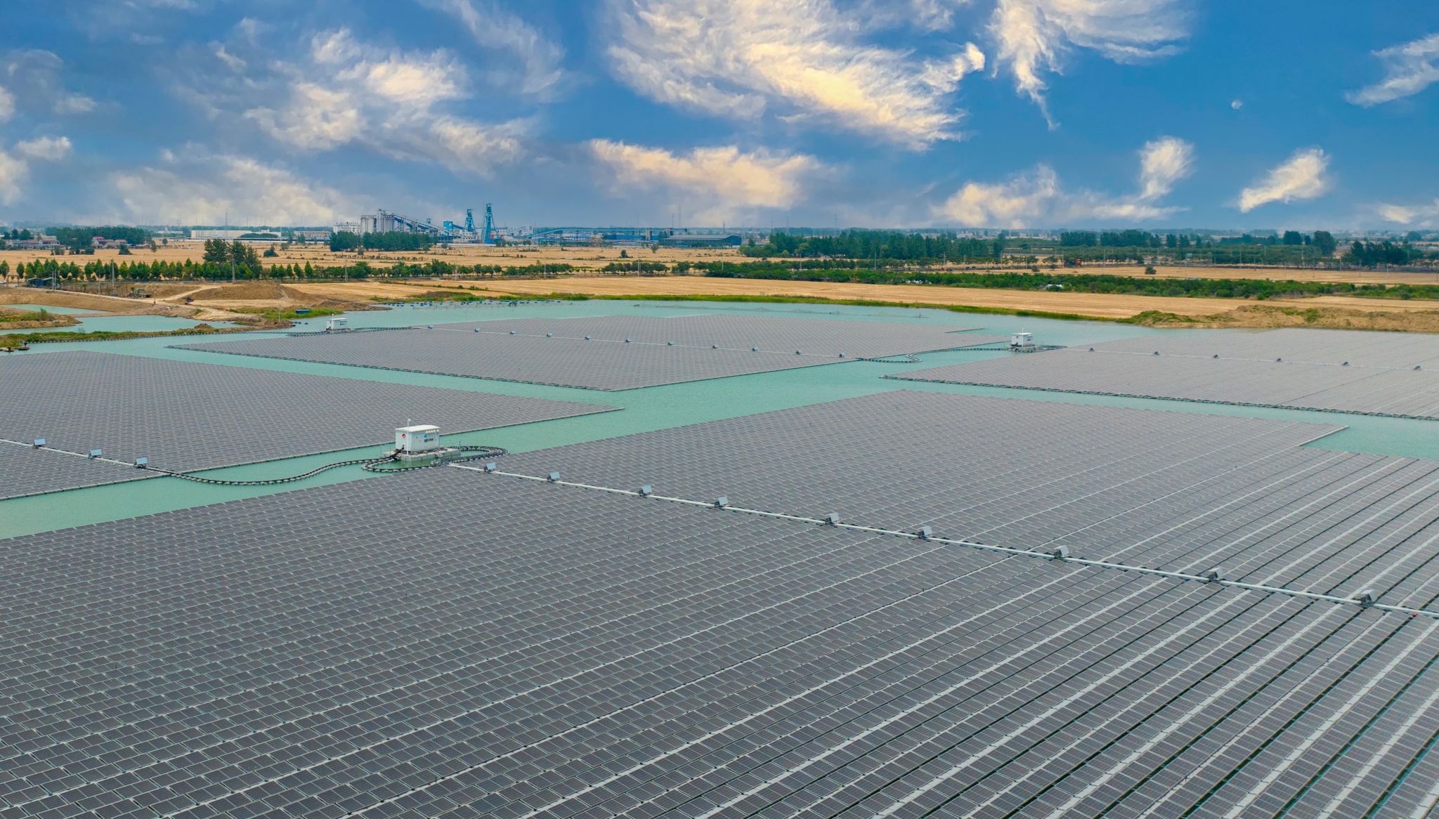 昔日的采煤沉陷區,如今鋪滿藍色光伏板。孫疃32兆瓦、青東28兆瓦、袁一90兆瓦水面光伏電站,每年生產綠電1.6億千瓦時,節省標煤約5.09萬噸,年減少二氧化碳排放13.74萬噸。